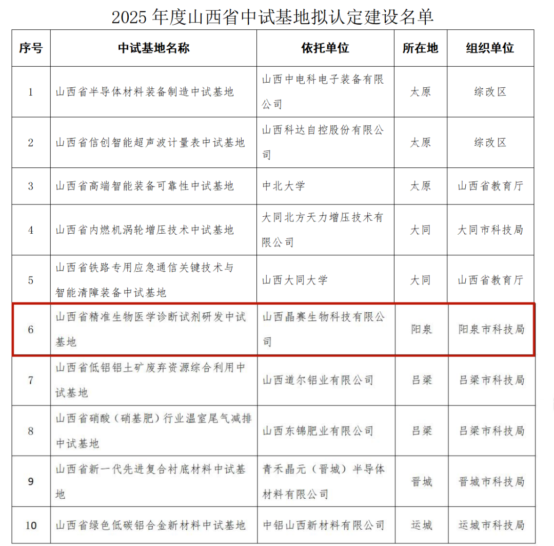 近日, 省科学技术厅公布 2025 年度 山西省中试基地拟认定建设名单, 阳泉高新区企业 —— 山西晶赛生物科技有限公司 申报的 山西省精准生物医学诊断 试剂研发中试基地, 成功入围, 成为高新区首家省级中试基地、 全市第二家省级中试基地。
