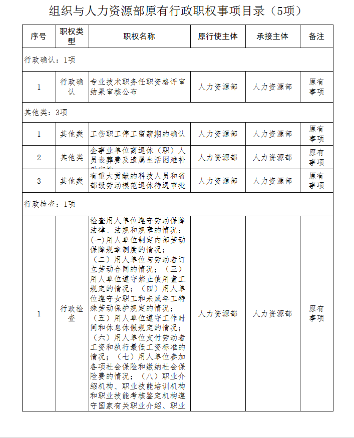 组织与人力资源部原有行政职权事项目录(5项)
