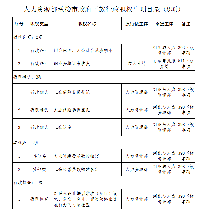 组织与人力资源部承接市政府下放行政职权事项目录(8项)